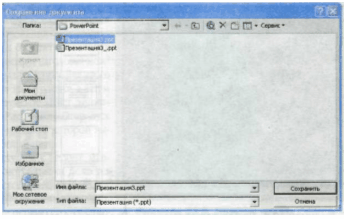 Обравши папку для збереження презентації, в полі "Имя файла" вказати назву презентації та клацнути по кнопці "Сохранить".
