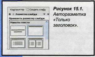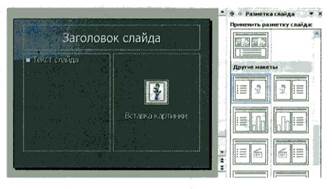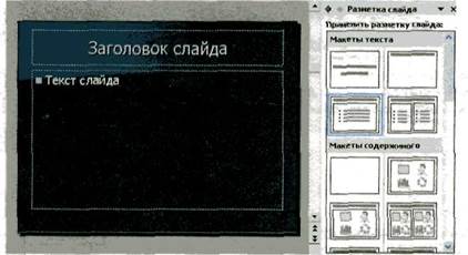 Для створення нового слайду потрібно клацнути по кнопці "Создать слайд", або обрати в меню "Вставка" пункт "Создать слайд", або натиснути комбінацію клавіш "Ctrl" + "M". У вікні PowerPoint з'явиться другий слайд. Із правого боку у вікні задач з'явиться розділ "Разметка слайда". В розділі "Макеты слайда" обрати авто розмітку "Заголовок и текст". Наш слайд прийме вигляд, як показано на (мал.13.1).