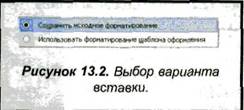 Для того щоб, зберегти параметри форматування заголовку повністю, потрібно клацнути по піктограмі "Параметри вставки", яка відобразиться під заголовком. З’явиться меню (мал.13.2), в якому встановити флаг "Сохранить исходное форматирование". Заголовок буде вставлений із збереженням всіх настройок форматування.