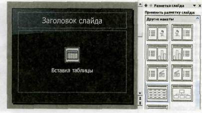 Можна вставити до нашого слайду таблицю, використавши авто розмітку. Цей шлях зручний при вставці невеликих простих таблиць. Для того щоб вставити таблицю, потрібно добавити новий слайд, обрати у вікні "Разметка слайда" авто розмітку "Заголовок и таблица". Буде створений слайд, що показаний на (мал.14.1).