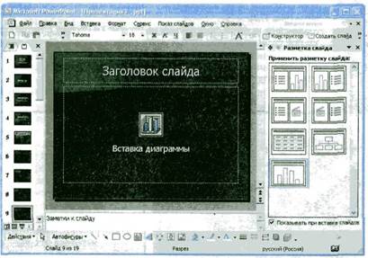 В центрі вікна розташований невідформатований шаблон першого, титульного слайду. З правого боку відображено вікно задач "Создание презентации". З лівого боку - "Область структури", знизу - "Область заміток". Зверху основного вікна розташований рядок заголовку із назвою презентації та трьома кнопками. Ліва кнопка "Свернуть" - звертає вікно без виходу із PowerPoint, середня - "Развернуть" -розгортає основне вікно або звертає його до стандартного розміру, права кнопка - "Закрыть" - закриває програму PowerPoint. Під рядком заголовку розташована панель меню, на якій відображено значок PowerPoint та дев'ять кнопок із назвами меню ("Файл", "Правка", "Вид", "Вставка", "Формат", "Сервис", "Показ слайдов", "Окно", Справка). Нижче розташована панель інструментів: "Стандартная" та "Форматирование". Знизу вікна розташована панель "Рисование". Кнопки на панелі інструментів служать для часто використаних команд.