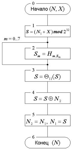 Шаг 0. Определение исходных данных для основного шага криптопреобразования, где N –преобразуемый 64-битовый блок данных, в ходе выполнения шага его младшая (N1) и старшая (N2) части обрабатываются как отдельные 32-битовые целые числа без знака. Таким образом, можно записать N=(N1,N2), а X – 32-битовый элемент ключа.
