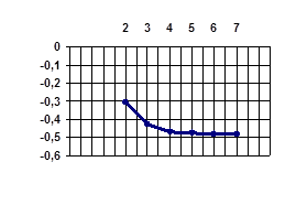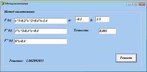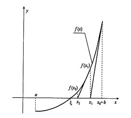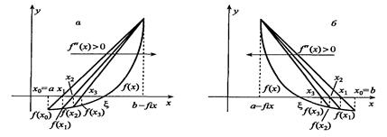 Отделения (локализации) корней, т.е. нахождение таких интервалов по аргументу x, внутри каждого из которых существует только один корень уравнения (2.1). Если у функции на концах исследуемого отрезка [a,b] функция имеет разные знаки, то на этом отрезке функция имеет не менее одного корня. Если же одинаковые знаки, то функция может не иметь корней или иметь четное число корней. Следовательно, локализация заключается в том, что необходимо установить отрезки, на которых есть смена знаков функции и, кроме того, выполнено условие единственности корня, т.е. функция на этом отрезке должна иметь первую производную с постоянным знаком. Из условия сходимости итерационной последовательности также требуется, чтобы вторая производная не меняла знак, т.е. на исследуемом отрезке функция бала бы только выпуклой или вогнутой.