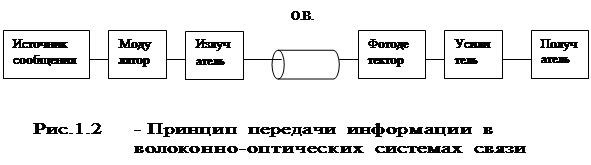 В наиболее общем виде принцип передачи информации в волоконно-оптических системах связи можно пояснить с помощью рис.1.2. На передающей стороне на излучатель, в качестве которого в ВОСП используется светодиод или полупроводниковый лазер, поступает электрический сигнал, предназначенный для передачи по линии связи. Этот сигнал модулирует оптическое излучение, в результате чего электрический сигнал преобразуется в оптический. На приемной стороне оптический сигнал из О.В. вводится в фотодетектор (Ф.Д). В современных ВОСП в качестве Ф.Д. используют p-i-n или лавинный фото диод (ЛФД).