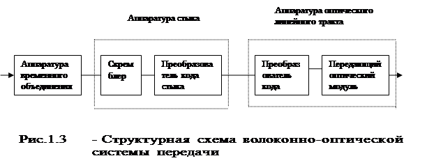 Для каждой иерархической скорости МККТТ рекомендует свои коды стыка, например для вторичной – код HDB-3, для четверичной – код CMI и т.д. Операцию преобразования бинарного сигнала, поступающего от аппаратуры временного объединения в код стыка, выполняет преобразователь кода стыка. Код стыка может отличаться от кода принятого в оптическом линейном тракте. Операцию преобразования кода стыка в код цифровой ВОСП выполняет преобразователь кода линейного тракта, на выходе которого получается цифровой электрический сигнал, модулирующий ток излучателя передающего оптического модуля. Таким образом, волоконно-оптические системы передачи строятся на базе стандартных систем ИКМ заменой аппаратуры электрического линейного тракта на аппаратуру оптического линейного тракта.