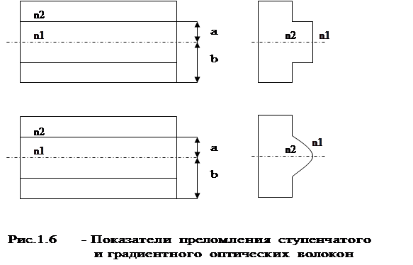 Различают оптические волокна со ступенчатым профилем, у которых показатель преломления сердцевины n1 одинаков по всему поперечному сечению, и градиентные - с плавным профилем, у которых n1 уменьшается от центра к периферии (рис.1.6).