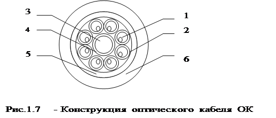 На сегодняшний день для городской телефонной сети отечественной промышленностью выпускаются кабели марки ОК имеющие четыре и восемь волокон. Конструкция ОК-8 приведена на рис.1. 7. Оптические волокна 1 (многомодовые, ступенчатые) свободно располагаются в полимерных трубках 2. Скрутка оптических волокон – повивная, концентрическая. В центре – силовой элемент 3 из высокопрочных полимерных нитей в пластмассовой трубке 4. Снаружи – полиэтиленовая лента 5 и оболочка 6. Кабель ОК-4 имеет принципиально те же конструкцию и размеры, но четыре ОВ в нем заменены пластмассовыми стержнями.