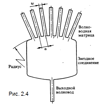 Перспективным направлением в развитии ВСМ является объединение дисперсионного и фокусирующего элементов. Впервые такое объединение было предложено и осуществлено путем создания квадратичного фазового распределения на выходе диспергирующей системы, получаемого в результате небольшого изменения длин оптических каналов диспергирующей системы. Фокусировка наблюдалась в планарном волноводе в фокальной плоскости фокусирующей системы. Сейчас описанная схема с незначительными изменениями используется в большинстве работ, посвященных ВСМ/Д. В подобной схеме вход и выход диспергирующей системы связаны с помощью двух звездных соединителей и волноведущих пластин, выполняющих роль фокусирующих элементов (рис. 2.2). Оптические сигналы на фиксированных