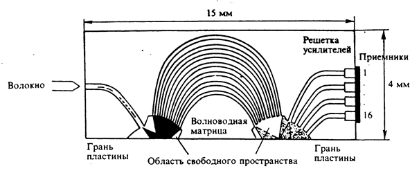 длинах волн (l1 , ... ln ) поступают с волоконного световода на вход одного из звездных соединителей, проходят по планарному волноводу и возбуждают канальные волноводы диспергирующей системы. Последние имеют постоянную разность оптического пути между соседними каналами. Во втором звездном соединителе оптические сигналы разделяются пространственно по длинам волн (l1 , ... ln ) и фокусируются на торцы выходных ВС. Таким образом, происходит демультиплексирование входных оптических сигналов. При обратном ходе лучей схема работает как мультиплексор.