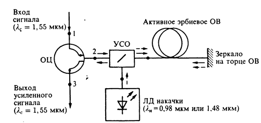 Увеличить развязку между противонаправленными оптическими сигналами, снизить требования к оптическим разветвителям, а следовательно, уровень помех и увеличить длину линии можно путем специального кодирования, при котором передача сигналов одного направления осуществляется в паузах передачи другого направления. Кодирование сводится к уменьшению длительности оптических импульсов и образованию длительных пауз, необходимых для развязки сигналов различных направлений. В ВОСП, построенных подобным образом, могут быть использованы эрбиевые волоконно-оптические усилители.