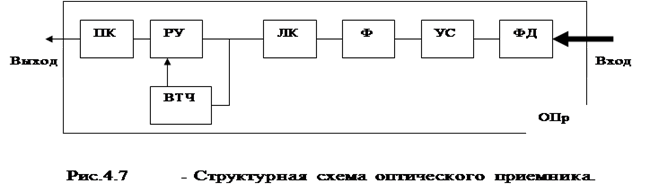 Фотодетектор преобразует падающее на него оптическое излучение в исходный электрический сигнал. Затем электрический сигнал поступает на усилитель (регенератор) и отправляется получателю сообщения.