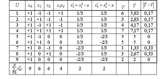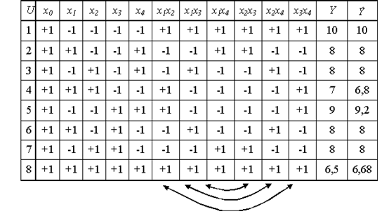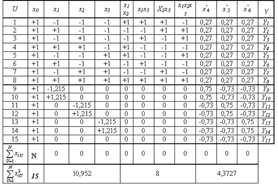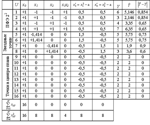 Нет необходимости проводить восемь раз (точки с 9 по 16) опыты в центре плана. Достаточно провести этот опыт один раз и записать результат во все восемь строк. Строки сокращать нельзя, так как нарушается свойство ортогональности, и коэффициенты полинома будут определены неверно.