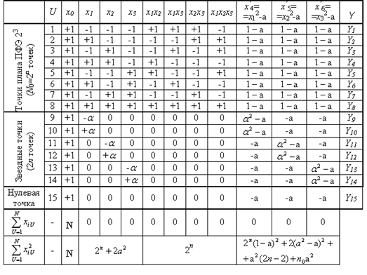 Например, для ОЦКП при числе факторов n=3 имеем следующие параметры плана
