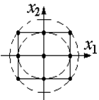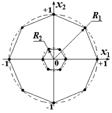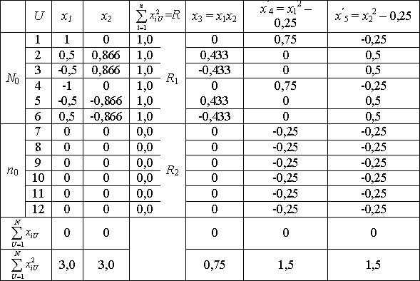 где V и W – текущие номера точек плана в двух подмножествах опытов N0 и n0 из их общего количества N, относящихся к двум разным концентрическим сферам. Одна из сфер может быть вырожденной, когда R2=0. Рассмотренный ранее ортогональный центрально-композиционный план второго порядка (ОЦКП) не является рототабельным планом, так как его точки лежат на трех концентрических окружностях (сферах, гиперсферах). При n=2 это очевидно из рис. 14. “Звездные” точки плана и точки плана ПФЭ 2n лежат на разных окружностях.