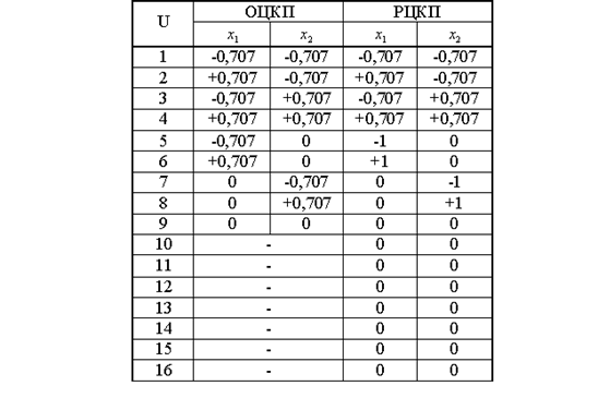 Значение факторов в ОЦКП и РОЦКП при переходе от естественной области планирования к единичному гипершару, при n = 2.