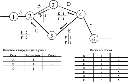 (на рисунке: маршрутизаторы 1-6, сегменты сетей A..F; приведена изначальная информация в маршрутизаторе 2 и информация в нем после двух итераций обмена маршрутными пакетами RIP; после определенного числа итераций маршрутизатор будет знать о расстояниях до всех сегментов, а также альтернативные маршруты)