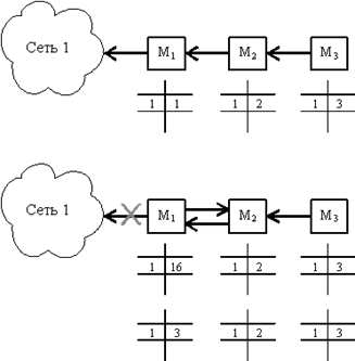 При обрыве связи с сетью 1 маршрутизатор М1 отмечает, что расстояние до этой сети приняло значение 16. Однако получив через некоторое время от маршрутизатора М2 маршрутное сообщение о том, что от него до сети 1 расстояние составляет 2 хопа, маршрутизатор М1 наращивает это расстояние на 1 и отмечает, что сеть 1 достижима через маршрутизатор 2. В результате пакет, предназначенный для сети 1, будет циркулировать между маршрутизаторами М1 и М2 до тех пор, пока не истечет время хранения записи о сети 1 в маршрутизаторе 2, и он не передаст эту информацию маршрутизатору М1.