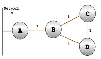 Предположим, что в некоторый момент времени канал, который связывает маршрутизаторы A и В, выходит из строя. Маршрутизатор B в этом случае перестает принимать update для сети N от маршрутизатора A и по истечении установленного интервала времени маршрутизатор B определяет сеть N в качестве недостижимой и исключает её из своих массивов update.