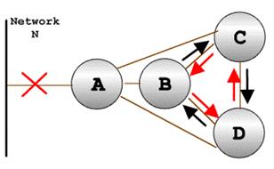 На рисунке приведен пример возникновения подобной ситуации. В приведенной сети при выходе из строя канала, который связывает узел А с сетью N, маршрутизатор B может принять от маршрутизатора С несуществующий маршрут до сети N, который якобы проходит через узел C. К тому моменту, когда маршрутизатор C определит, что он не имеет собственного маршрута до сети N, маршрутизатор B уже успеет передать информацию о наличии у него маршрута до этой сети марщрутизатору D.