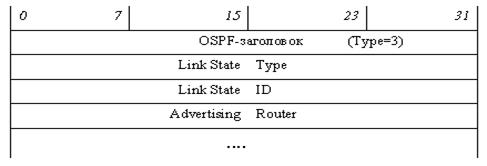 Сообщение содержит один или несколько идентификаторов записей, которые маршрутизатор хочет получить от своего соседа. Каждый идентификатор записи состоит из полей «Link State Type», «Link State ID» и «Advertising Router»; значения этих полей будут рассмотрены при обсуждении заголовков объявлений о состоянии связей (LSA). Число идентификаторов (то есть число запросов) в одном сообщении определяется из общей длины сообщения, указанной в OSPF‑заголовке.