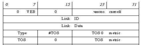 · Объявление о каждой связи состоит из полей «LinkID», «LinkData», «Type», «#TOS», «TOS 0 metric», за которыми может следовать 0 или более 32‑разрядных слов, состоящих из полей «TOS», нулевого октета и «TOSmetric». Количество таких слов определяется полем «#TOS».