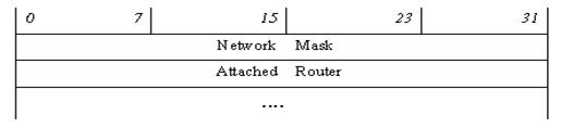 · Network Mask (4 октета) – маска сети множественного доступа (адрес этой сети указан в поле «Link State ID» заголовка LSA).