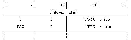 Поле «NetworkMask» (4 октета) содержит значение маски сети, если это LSA типа 3, или все единицы, если это LSA типа 4. Далее следует 32‑битное слово, два последних октета которого содержат метрику расстояния по умолчанию (тип сервиса 0), после которого может следовать 0 или более 32‑битных слов, объявляющих метрики расстояний для маршрутизации по типам сервиса – аналогично тому, как это сделано в LSA типа 1. Несмотря на то, что маршрутизация по типу сервиса исключена из последней версии стандарта OSPF, эти поля поддерживаются для совместимости с предыдущими версиями.