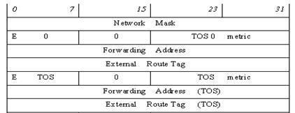 Далее следует одна или более записей с указанием метрики и других характеристик маршрута до данной сети для разных типов сервиса (поля «ETOS», «TOSmetric», «ForwardingAddress», «ExternalRouteTag»). Первыми указываются характеристики для TOS=0 (т.е. когда тип сервиса не учитывается), эта часть присутствует обязательно. Число прочих типов сервиса, представленных в LSA, определяется из общей длины LSA, указанной в заголовке LSA. Несмотря на то, что маршрутизация по типу сервиса исключена из последней версии стандарта OSPF, соответствующие поля поддерживаются для совместимости с предыдущими версиями.