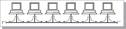 Топология шина (или, как ее еще называют, общая шина) самой своей структурой предполагает идентичность сетевого оборудования компьютеров, а также равноправие всех абонентов по доступу к сети. Компьютеры в шине могут передавать только по очереди, так как линия связи в данном случае единственная. Если несколько компьютеров будут передавать информацию одновременно, она исказится в результате наложения (конфликта, коллизии ). В шине всегда реализуется режим так называемого полудуплексного (half duplex) обмена (в обоих направлениях, но по очереди, а не одновременно).