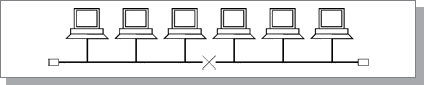 В случае разрыва или повреждения кабеля нарушается согласование линии связи, и прекращается обмен даже между теми компьютерами, которые остались соединенными между собой. Короткое замыкание в любой точке кабеля шины выводит из строя всю сеть.