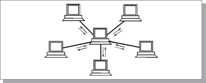 Звезда (star) - к одному центральному компьютеру присоединяются остальные периферийные компьютеры, причем каждый из них использует отдельную линию связи (рис. 4). Информация от периферийного компьютера передается только центральному компьютеру, от центрального — одному или нескольким периферийным.