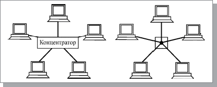В центре сети с данной топологией помещается не компьютер, а специальное устройство — концентратор или, как его еще называют, хаб (hub), которое выполняет ту же функцию, что и репитер, то есть восстанавливает приходящие сигналы и пересылает их во все другие линии связи.