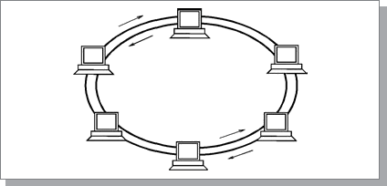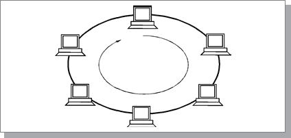 Кольцо — это топология, в которой каждый компьютер соединен линиями связи с двумя другими: от одного он получает информацию, а другому передает. На каждой линии связи, как и в случае звезды, работает только один передатчик и один приемник (связь типа точка-точка). Это позволяет отказаться от применения внешних терминаторов.