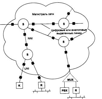 Типичный пример структуры глобальной компьютерной сети приведен на рис. 9. Здесь используются следующие обозначения: S (switch) - коммутаторы, К - компьютеры, R (router) - маршрутизаторы, MUX (multiplexor)- мультиплексор, UNI (User-Network Interface) - интерфейс пользователь - сеть и NNI (Network-Network Interface) - интерфейс сеть - сеть. Кроме того, офисная АТС обозначена аббревиатурой РВХ, а маленькими черными квадратиками - устройства DCE,о которых будет рассказано ниже.