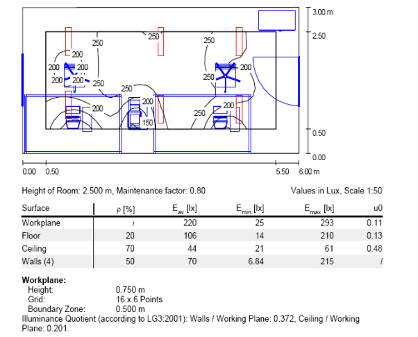Відповідно до нормативу ДНАОП 0.00-1.31-99 освітленість повинна перебувати в межах 300-500 Лк. З вище наведеної схеми розподілу освітленості в приміщенні бачимо, що все в нормі.