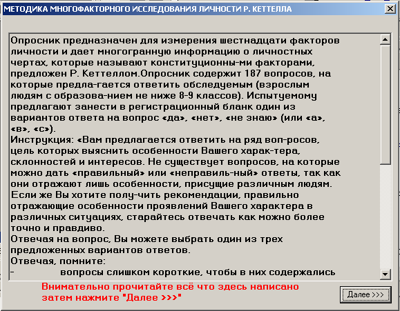 Данном курсовом проекте рассмотрен программный продукт “Методика многофакторного исследования личности Р. Кеттелла”. Он представляет собой опросник из 187 вопросов, определяющий шестнадцать факторов личности и дает многогранную информацию о личностных чертах, которые называют конституционными факторами, предложен Р. Кеттеллом.