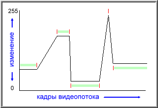 Прямое значение - это число, вычисленное как разница между текущим и предыдущим значениями цветовой плоскости пикселя. Прямое значение всегда положительное число и вычисляется как разница по модулю. Нужно заметить, что разница вычисляется между крайними точками диапазона изменения, когда значение цветовой плоскости пикселя закончило увеличиваться или уменьшаться. Ниже я привел рисунок в виде графика поведения цветовой плоскости пикселя. Красными черточками выделены места, где один код поведения сменяет другой, а в поведении кодируется количество кадров повторения и разница изменения, или только количество кадров повторения при отсутствии изменений. Для наглядности светло-зеленым цветом выделены поведения, когда цветовая плоскость пикселя остается неизменной.