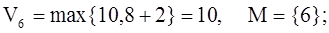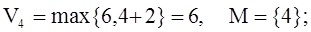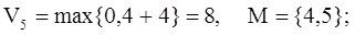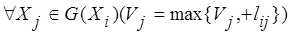 Очевидно, что к каждой вершине могут идти от вершины X н несколько путей, суммы длин дуг по разным путям различны. При поиске длиннейшего пути следует выбирать максимальную сумму. Волны распространения веса по разным путям доходят до каждой вершины последовательно, при очередной волне необходимо оставить либо старый вес вершины, либо заменить его на новый (больший). Поэтому при расчете веса вершины X i за счет волны, подошедшей к ней по дуге (X j , X i ), производится вычисление веса V i по формуле V i =max (V i , V j + l ji ).