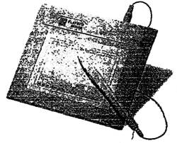 Планшет забезпечує введення в комп'ютер двохмірного зображення у вигляді растрової таблиці. В склад пристрою входить спеціальний вказівник типу олівця з вмонтованим в нього датчиком. Внутрішній контролер планшета надсилає електричні імпульси по ортогональній сітці провідників, що знаходяться під площиною планшета. Отримавши два таких сигнали, контролер перетворює їх в координати, що передаються в ПК. Комп'ютер перетворює цю інформацію в координати точки на екрані монітора, координати якої відповідають координатам вказівника на планшеті. Зовнішній вигляд планшета наведено на рисунку 2.13.