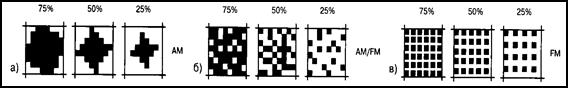 Рисунок 2 – Передача півтонів зміною: а) розміру друкарських елементів постійного кроку –"амплітудне растрування"; б) площі елементів і частоти їхнього розміщення – змішана "АМ/ЧМ модуляція"; в) частоти розміщення однакових елементів –"частотна модуляція"