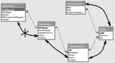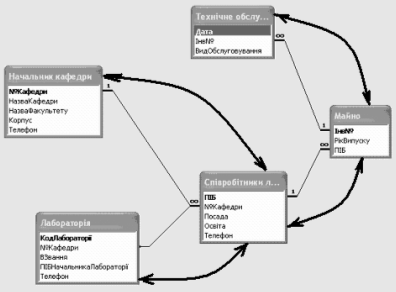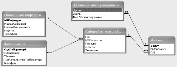 Полючи в шостьох таблицях повинні бути скоординовані таким чином, щоб відображати зведення про одне й те саме замовлення. Ця координація здійснюється шляхом встановлення зв'язків між таблицями. Зв'язок між таблицями встановлює стосунки між співпадаючими значеннями в ключових полях, звичайно між полями, що мають однакові імена в обох таблицях. У більшості випадків із ключовим полем однієї таблиці, що є унікальним ідентифікатором кожного запису, зв'язується зовнішній ключ іншої таблиці. Наприклад, для зв'язування співробітників лабораторії кафедри із відповідальним майном, за які вони відповідають, варто створити зв’язок між полями «ПІБ».