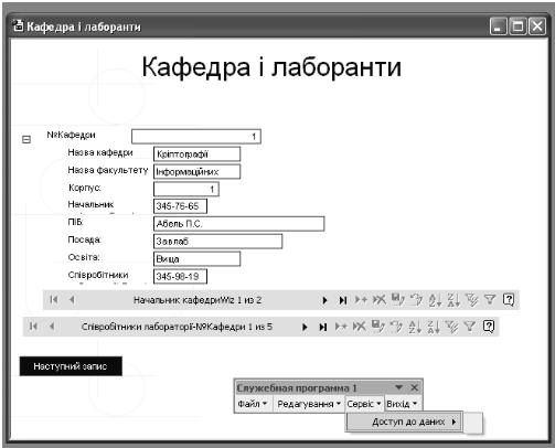 Поперше ниж скористатися пунктами випливаючого меню, необхідно закрити форму (кнопка „Закрити форму”), яка зявляється автоматично при відкритті БД „Кафедра”, так як меню демонструє команди на прикладі цієї форми.