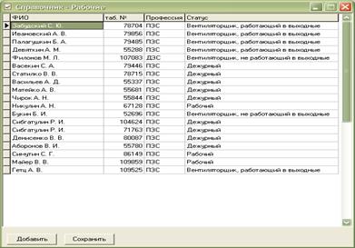Команда «Справочник рабочих», вызывает окно содержащее сведения о рабочих, предоставляющее возможность добавления или изменения данных о рабочих. Окно представлено на Рисунке 7.4