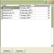 Команда «Справочник отпусков», вызывает окно содержащее сведения об отпусках рабочих, предоставляющее возможность добавления или изменения данных об отпусках. Окно представлено на Рисунке 7.5
