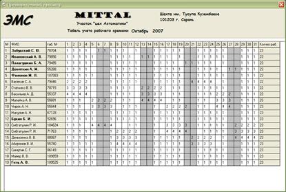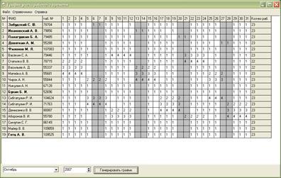В данной программе можно просмотреть и распечатать отчет, содержащий информацию о графике учета рабочего времени на заданный месяц.