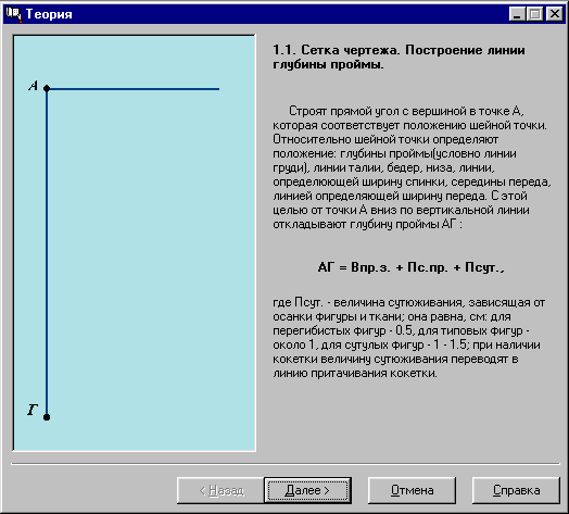 Весь процесс построения чертежа основы представлен в диалоговом режиме. Т.е. каждому этапу построения изделия должен соответствовать интерактивный теоретический материал описывающий действия по его построению.