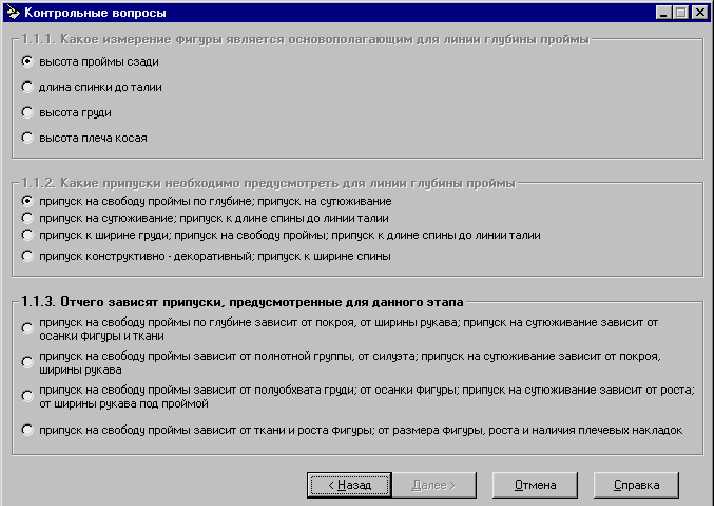 Программой предусмотрено 31 вопрос по всему теоретическому материалу построения основы. Независимо от того, как студент ответил на вопрос, он автоматически переходит к следующему вопросу. После ответа на все вопросы, он получает оценку. Таким образом, можно проводить зачетные занятия.