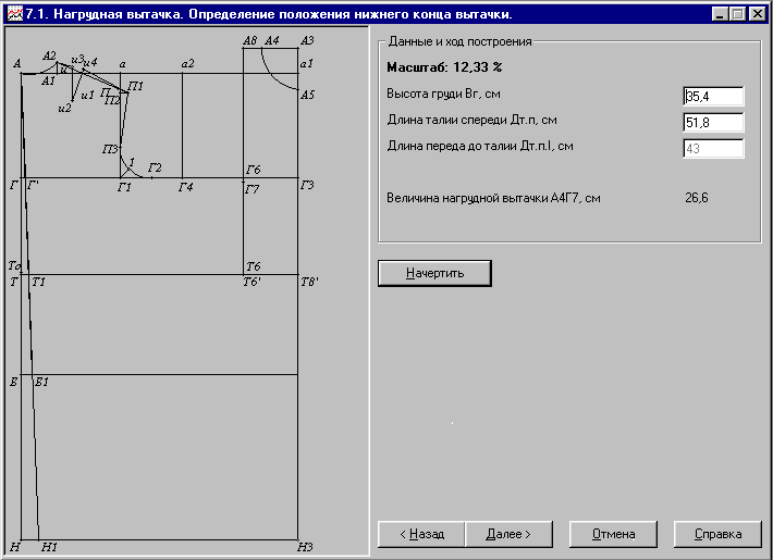 После удовлетворительного ответа на тестовые вопросы студент переходит к практической реализации прочитанного материала. Ему предлагается построить в масштабе фрагмент чертежа основы. Вводя нужные значения величин, студент получает фрагмент чертежа.