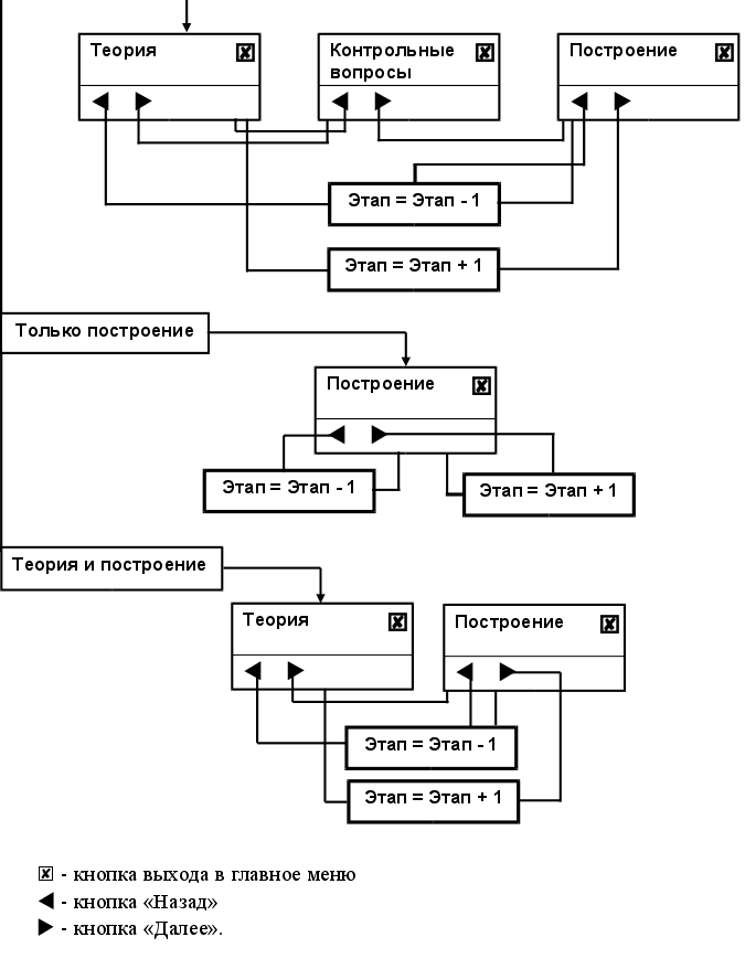 Пользователю приложение предоставляет сначала прочесть теоретический материал, затем ответить на тестовые контрольные вопросы и перейти к процессу построения.