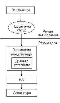 Архитектура ввода / вывода в WindowsXP имеет иерархическую структуру. Для осуществления операции ввода / вывода пользовательское приложение должно вызвать одну из функций API. Эта функция создает необходимый IRP пакет и направляет его подсистеме ввода / вывода. Подсистема ввода / вывода направляет IRP пакет необходимому драйверу. Драйвер осуществляет обращение к устройствам, используя функции HAL.
